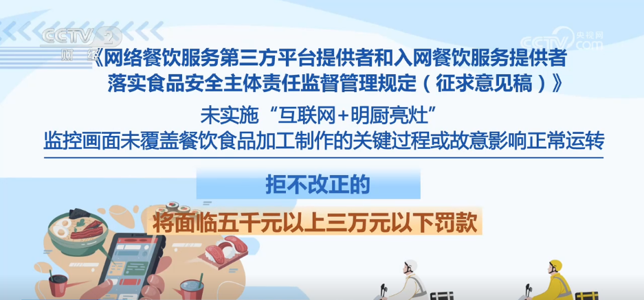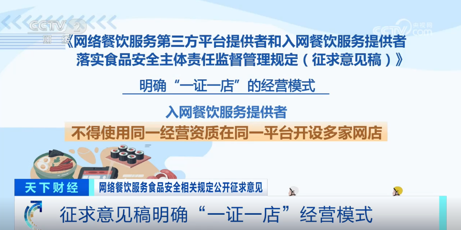 收罗看法稿明白“一证一店”的运营模式。对餐饮食物进行包拆、封口,留存刻日不得少于2年。为进一步加强收集餐饮办事食物平安监管,网店招牌名称该当取实体运营门店招牌名称分歧,记者10月16日从市场监管总局领会到,入网餐饮办事供给者该当实施“互联网+明厨亮灶”,未实施“互联网+明厨亮灶”、画面未笼盖餐饮食物加工制做的环节过程或居心影响一般运转,平台该当正在网店首页加注“无堂食”标识。